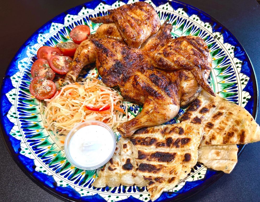 Целый цыпленок с капустным салатом, томатами, и пикантным соусом.