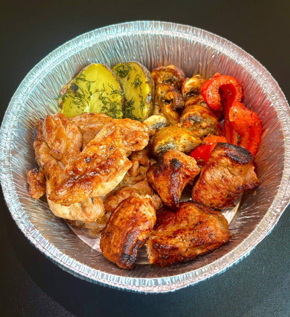 Свинина, курица, грибы, перец, картофель, хлеб, два вида соуса, маринованный лук, капуста
